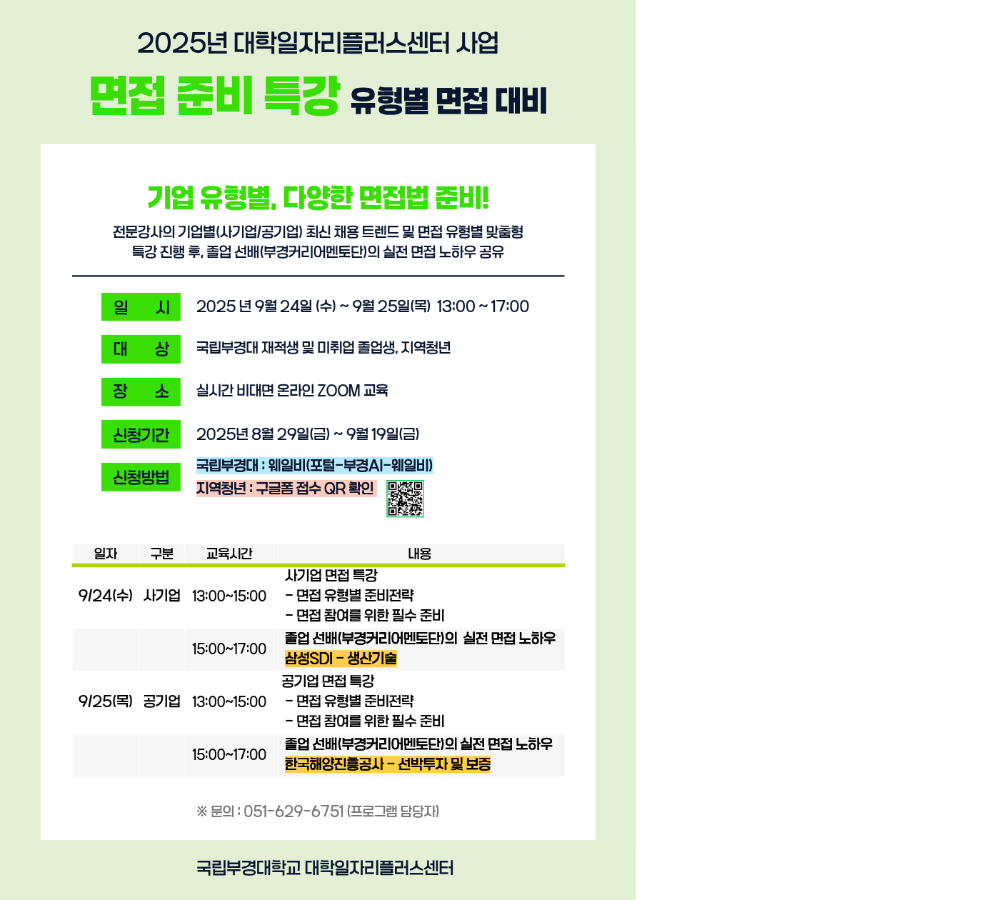 2025년 하반기 채용에 대비하여 ‘면접 준비 특강(유형별 면접 대비)’을 진행하오니 학생 여러분들의 많은 신청 바랍니다.