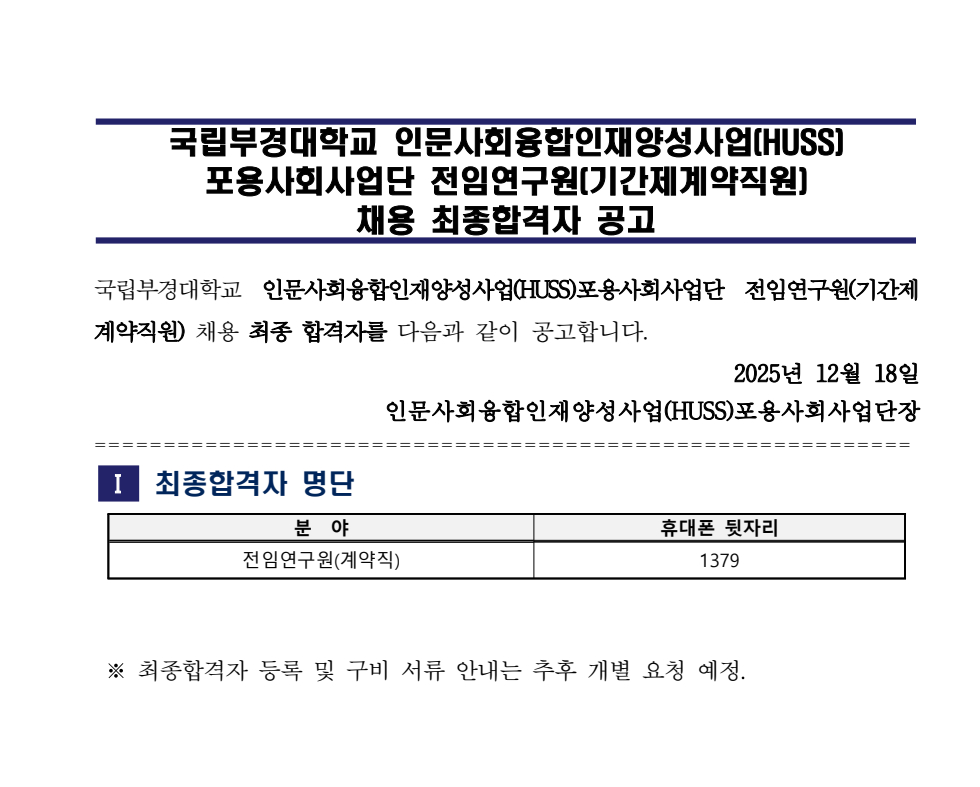 국립부경대학교 인문사회융합인재양성사업(HUSS)포용사회사업단 전임연구원(계약직원) 채용 최종합격자 공고
