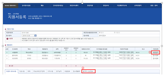 o 합격자신상정보등록: 코러스접수메뉴 (http://pknu.korus.kr) 채용 → 채용분야등록 → 1회차 → 접수중인지원서조회 → '합격자신상정보' 입력