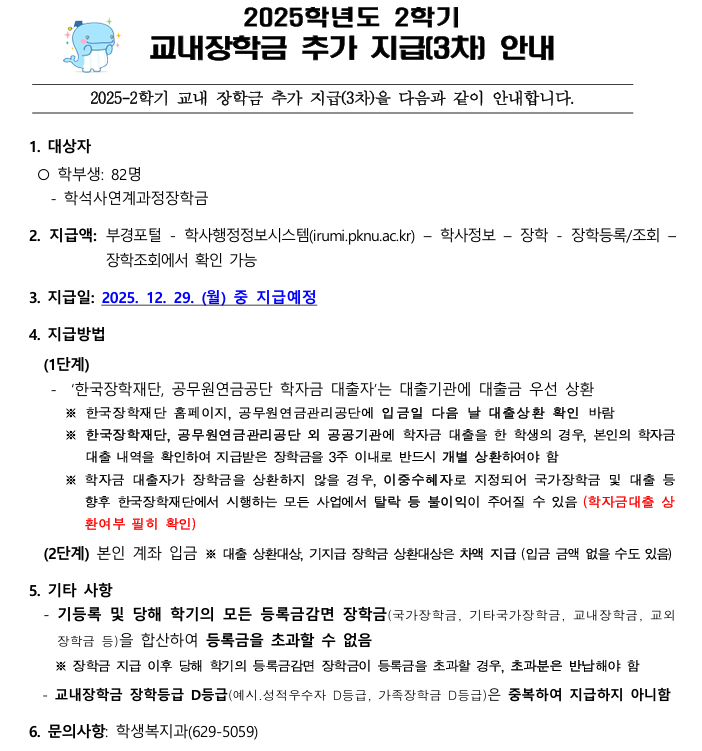 2025학년도 2학기 교내장학금 추가 지급(3차) 안내