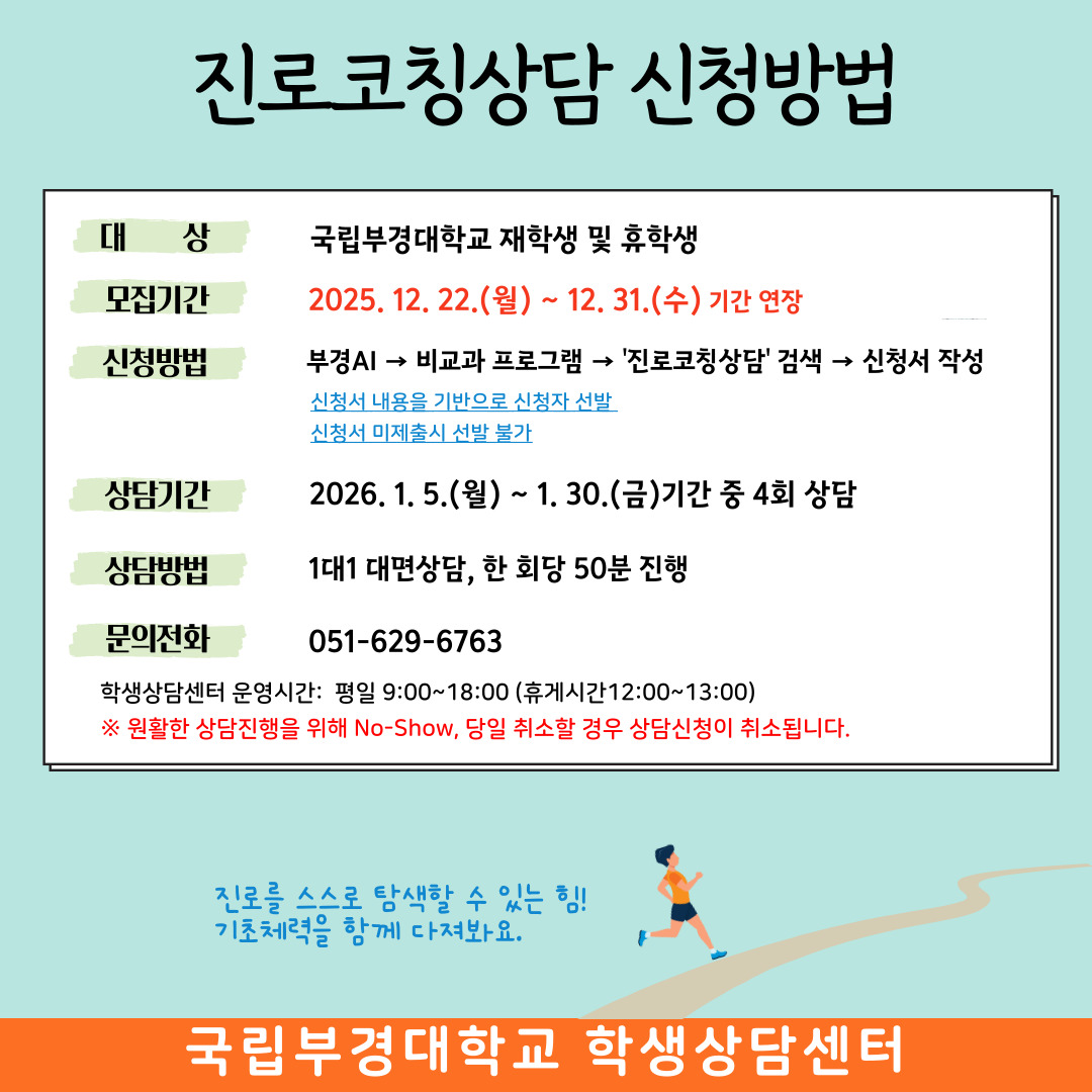 신청방법: 부경AI → 비교과 프로그램 → ‘진로코칭상담’ 검색 후 신청