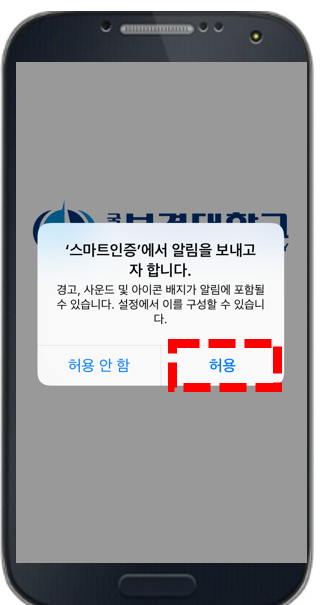 - 1. 부경대학교 스마트인증 앱을 최초 실행 시 개인정보 취급 동의 체크 후 “동의하고 시작하기“ 클릭