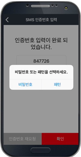 - 2. 부 인증방식 선택(비밀번호, 패턴, 택1)