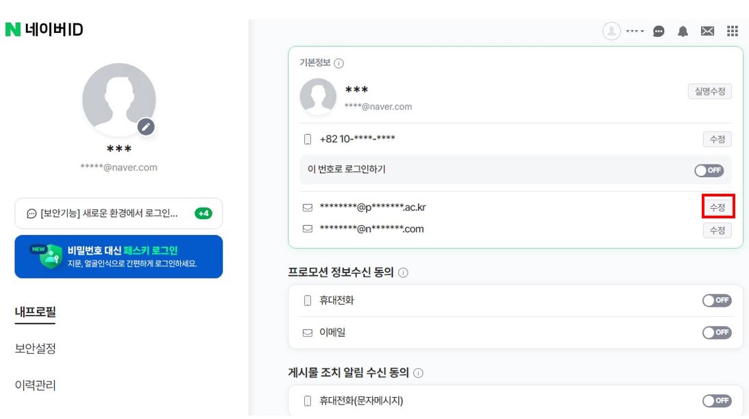 - 2. 내프로필 메뉴에 등록된 이메일 중 최상단 이메일 확인하고 연동하고자하는 이메일 주소로 변경