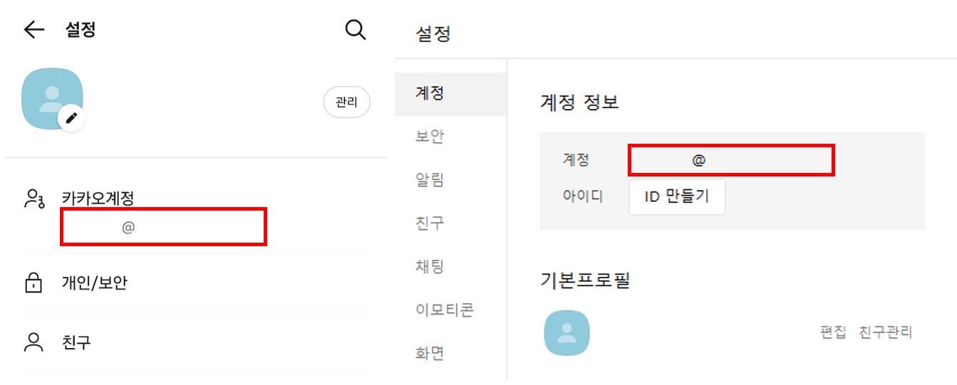 카카오톡 설정 이동하여 계정 정보 확인(좌 - 카카오톡 모바일 / 우 - PC 카카오톡) |