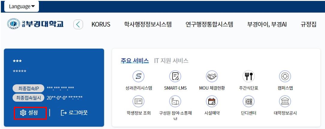 - 1. 개인정보 변경 위해 국립부경대학교 포털시스템 접속하여 로그인 후 설정 버튼 클릭