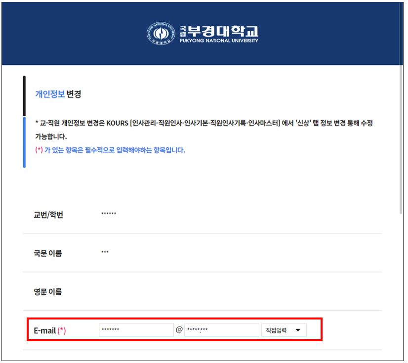 * KORUS 운영 정책상 데이터 수정 후 학사행정정보시스템 데이터 연동까지 10분정도 시간 소요됨 - ※ 네이버 계정과 연동 원하는 경우, 네이버 최상단 이메일을 이메일(학내, pknu.ac.kr)로 등록거나 이메일(외부)로 등록하여 연동 가능