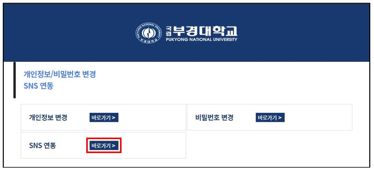 - 국립부경대학교 포털시스템 SNS 로그인 기능은 현재 네이버, 카카오 로그인 기능 제공하며 포털시스템 계정당 하나의 SNS 계정 연동만 제공