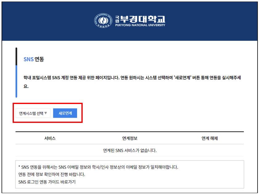 1. 국립부경대학교 포털시스템 설정 기능 중 SNS연동 메뉴 클릭 | 2. 원하는 SNS 연동 방식 선택 후 '새로연계' 버튼 눌러 연동 진행 |