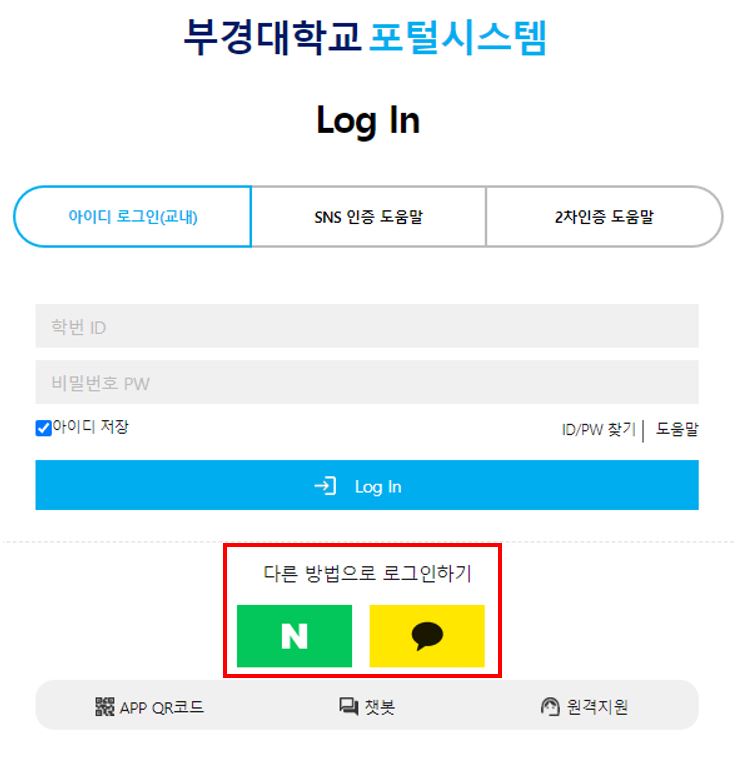 - 1. 국립부경대학교 포털시스템 로그인 페이지에서 연동한 SNS 버튼 클릭하여 해당 SNS 로그인 통해 포털시스템 로그인 진행